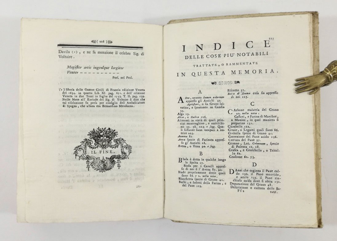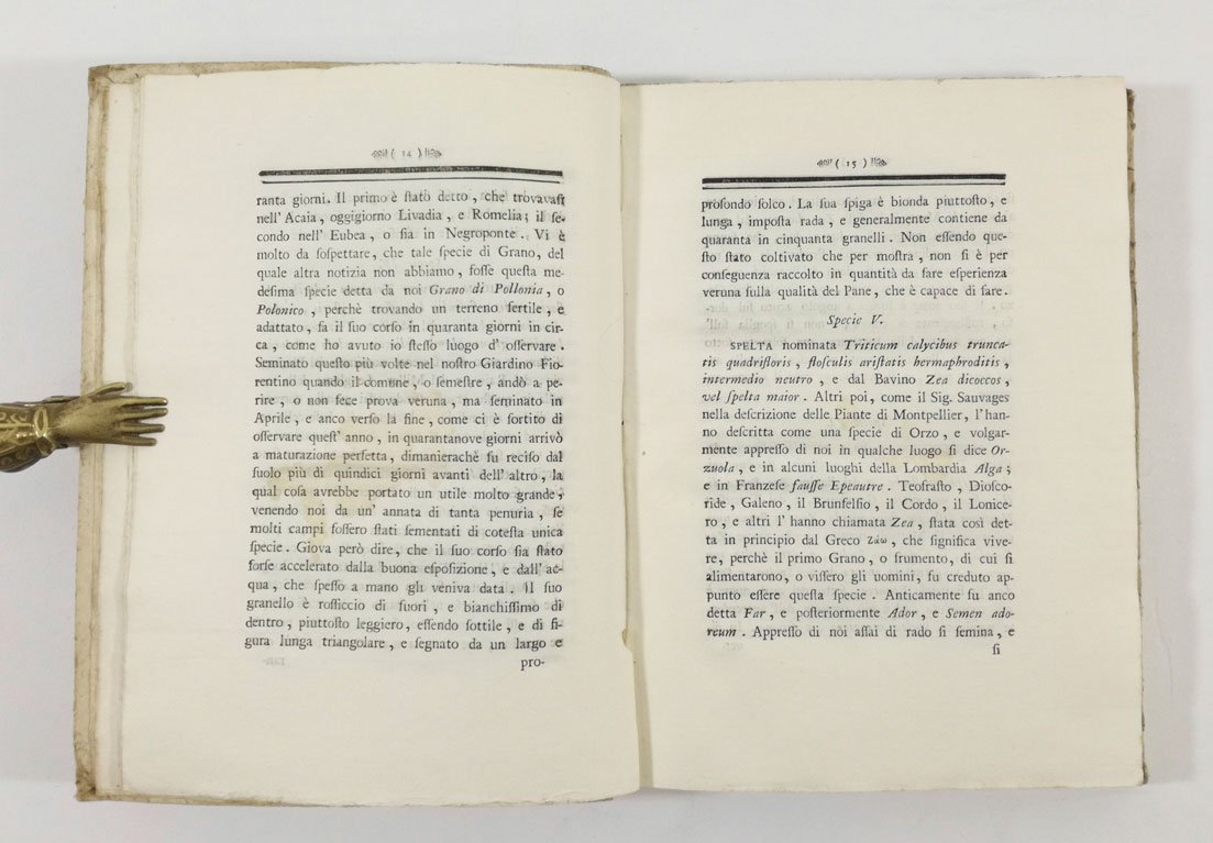 LIBRORara prima edizione.Esemplare in ottime condizioni, molto fresco e ad ampi margini. Trattato sulla panificazione del medico e botanico italiano Saverio Manetti (1723-1785), autore anche di una fortunata ornitologia. “La penuria grandissima in genere di Frumento d’ogni sorte, e di Biade, e particolarmente di Grano, accaduta in quest’anno per quasi tutta l’Italia, mi ha somministrato materia, sopra cui non poche riflessioni mi è sortito di fare, e nel tempo medesimo mi ha presentato un adattato argomento da trattenere anco Voi, Illustrissimi, e Virtuosissimi Socj, che in modo particolare dello studio di Botanica, e della Fisica vi dilettate, e che all’osservazione, e spiegazione de’ fenomeni della natura ogni vostra più premurosa attenzione dirigiete [.]” (’Memoria sopra il Frumento in generale, e in particolare, la Panizzazione, e quei Vegetabili, che per alimento degli uomini partecipano delle qualità del Frumento, e che per conseguenza possono panizzarsi, o al Pane sostituirsi’, p. 1).