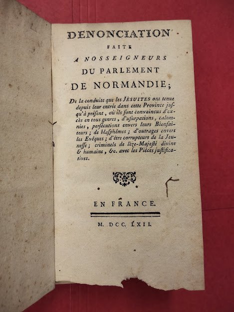 Denonciation faite a Nosseigneurs du Parlement de Normandie; De la conduite que les Jèsuites ont tenue depuis leur entrèe cette Province jusqu'à present, où ils sont convaicus d'excès en tous genres.