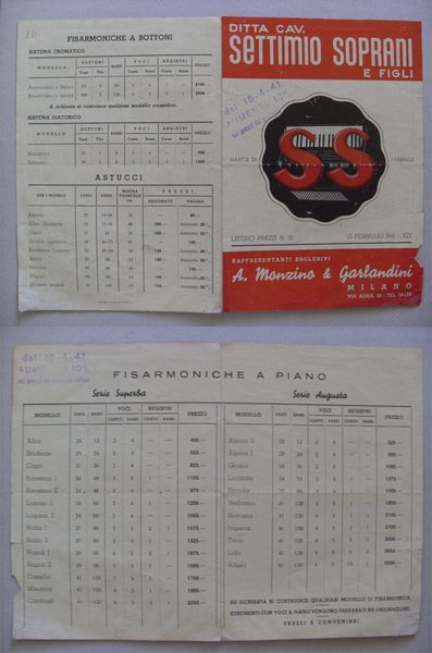 Depliant + listino prezzi Ditta Cav. SETTIMIO SOPRANI - Fisarmoniche a piano. 1941