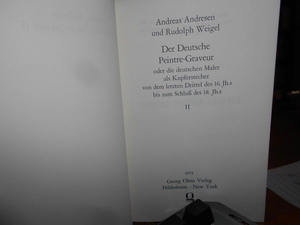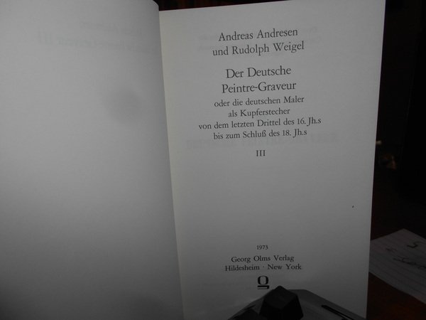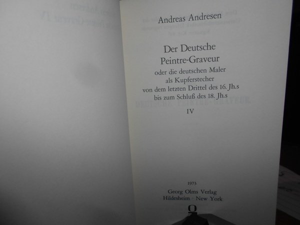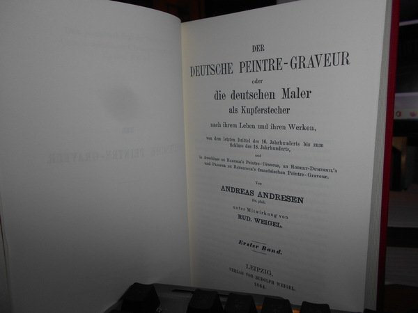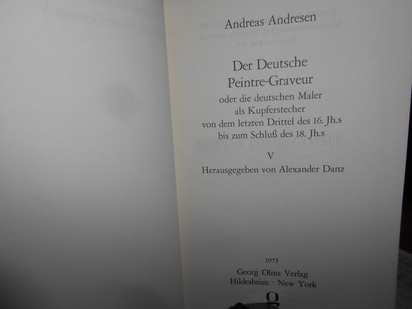 ANDREAS ANDRESEN. Hildesheim-New York, Georg Olms Verlag, 1973. DER DEUTSCHE PEINTRE-GRAVEUR (1560 - 1800). 5 volumi in-16° grande, tela rossa edit. con titoli in oro. xiv, 448 pp.; (4), 424, (2) pp.; (4), 393, (1) pp.; (6), 370 pp.; (9), 412 pp. Come nuovi. Famoso repertorio sulla vita e le opere dei pittori incisori tedeschi dal 1560 al 1800 (ristampa anastatica dell'opera originale). Uff. E - V - 3 - 2
