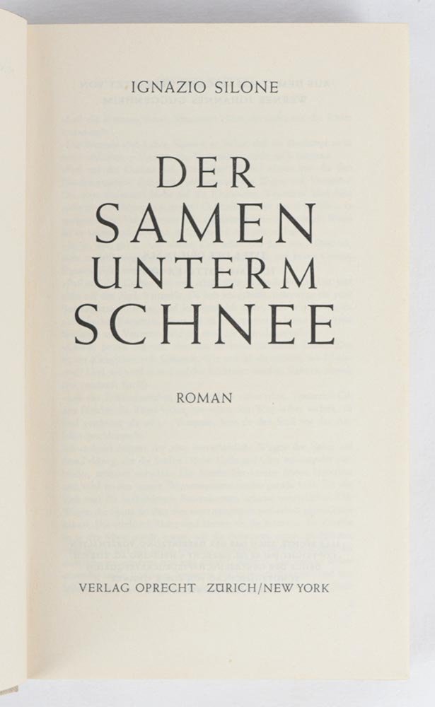 LIBRO Edizione originale. Ottimo esemplare, fresco e pulito, completo della rara sovracoperta. Terzo romanzo dell’autore, «Il seme sotto la neve» è il sequel di «Pane e vino». Già in programma nel 1936, appena pubblicato quest’ultimo, la lavorazione fu ritardata da altri progetti — primo fra tutti quello della «Scuola dei dittatori» — che ne posticiparono l’uscita originale alla fine del 1941, nella traduzione tedesca del drammaturgo svizzero Werner Johannes Guggenheim (1895-1964): «L’anno del copyright è il 1942, ma sia una nota che figura sul verso del frontespizio della successiva edizione italiana, sia le date delle prime recensioni confermano che il libro era già apparso alla fine dell’anno precedente» (Falcetto). Falcetto (cur.), Silone: Romanzi e saggi 1927-1944 (I Meridiani), p. 1523-4; D’Eramo, Ignazio Silone (Roma 2014), p. 196-s (con imprecisioni)