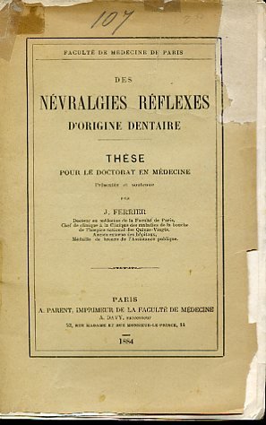 In-8°, pp. 76, brossura editoriale (con restauri alla porzione superiore destra del piatto anteriore). In barbe, intonso, con sparse fioriture. Pubblicazione della Facoltà di Medicina di Parigi. L'autore operava nella Clinica per le malattie della bocca dell'Hospice National des Quinze-Vingts di Parigi.