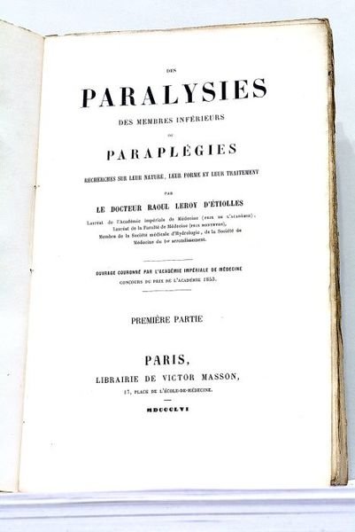 Des Paralysies des Membres Inférieurs ou Paraplégies. Recherche sur leur Nature, leur Forme et leur Traitement. Ouvrage couronné par l'Académie Impériale de Médecine. Première partie.