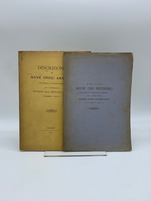 2 opuscoli in 8 (cm 17 x 24), pp. 41 + (1b) con 9 tavole incise all'acquaforte raffiguranti le croci descritte; 10 + (2b). Brossura editoriale. Omaggio autografo dell'A. al frontespizio di entrambi. Due saggi consecutivi di Servanzi Collio, che descrive alcune antiche croci processionali e devozionali marchigiane conservate in Sanseverino, Carpignano, Recanati, Serra Petrona, Pitino e Montecassiano (nel primo saggio) e quelle della Collegiata di S. Esuperanzio di Cingoli e della Chiesa Parrocchiale di Santa Barbara nel castello di Crespiero della Diocesi di Camerino (nel secondo saggio).