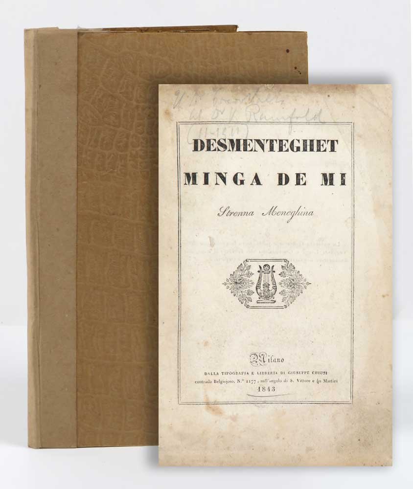 LIBROPrima edizione.Esemplare mancante delle pp. 81-128 (le ultime quarantanove pagine), in modesta legatura moderna, con la prima e ultima carta brunite; per il resto in ordine.Rarissima strenna di poesia milanese. Fu pubblicata soltanto nel 1843 e nel 1844 e comprende componimenti poetici in dialetto firmati, spesso solo con sigle o pseudonimi.
