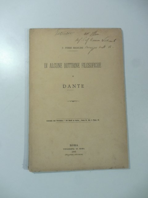 In 8 (cm 15 x 22,5), pp. 43 + (1b). Omaggio autografo al piatto anteriore. Brossura editoriale. Estratto editoriale da 'Gli Studi in Italia'.