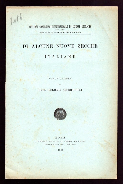 Opuscolo vintage. Estratto dagli Atti del Congresso Internazionale di Scienze Storiche - Vol. VI - sezione Numismatica. Intonso. Illustrazioni in bn all'interno del testo. Ordinario segno del tempo.
