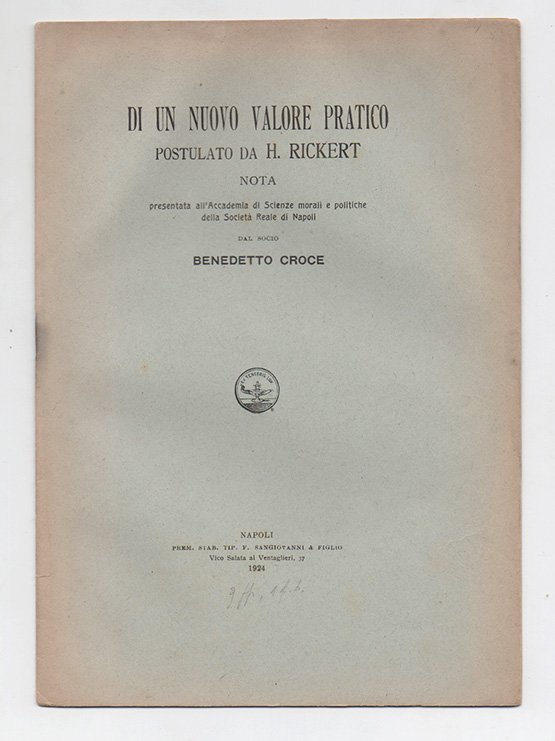 Di un nuovo valore pratico postulato da H. Rickert — Nota letta all’Accademia di Scienze morali e politiche della Società reale di Napoli dal socio Benedetto Croce