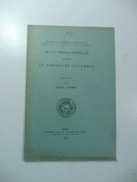 In 8 (cm 16 x 24), pp. 13 + (2) con 1 illustrazione nel testo. Pagine intonse. Brossura editoriale. Saggio relativo al ritrovamento di una lastra marmorea sotterranea rinvenuta durante i lavori di scavo della fognatura di corso Garibaldi a Reggio Calabria. La lastra presentava un'iscrizione che fu detta riferirsi, secondo analisi e interpretazione del prof. Orsi, alle terme dell'antica Regium.