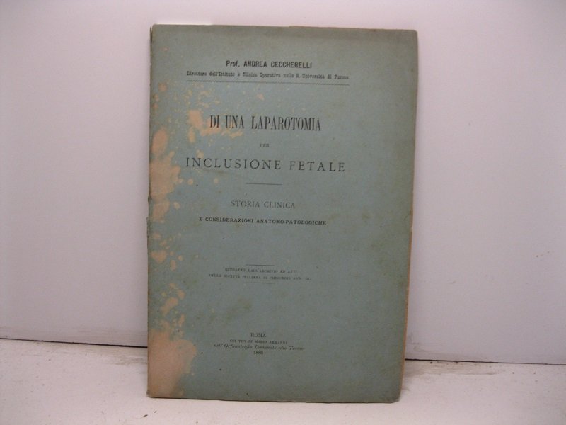In 8, pp. 44 con 6 tavv. f.t. in lit. Macchie al marg. int. del p. ant. Strappetti al marg. est. del p. post. Br. ed. Descrizione di una laparatomia per inclusione fetale in una bambina di undici anni ricoverata per dolori addominali. Spiegazione del caso clinico e dell'operazione.