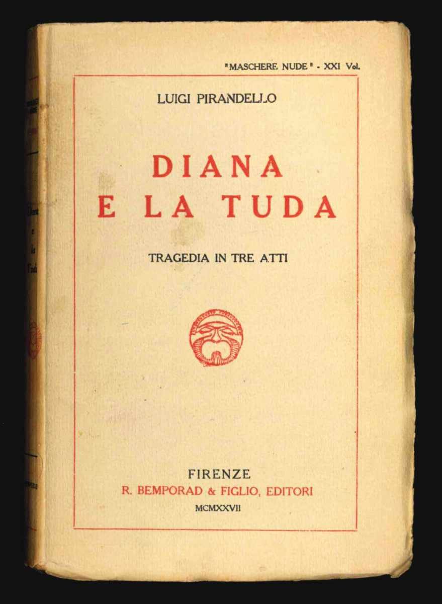 LIBROPrima edizione.Ottimo esemplare (dorso lievemente brunito e leggerissime tracce di usura alla brossura).Prima edizione della tragedia in tre atti di Luigi Pirandello «Diana e la tuda». Composta intorno al 1925 e presentata in anteprima in lingua tedesca al teatro di Zurigo nel novembre del 1926 con il titolo «Diana und die Tud», l’opera drammaturgica sviluppa il tema dell’artista alla ricerca della perfezione attraverso le proprie opere e della disperazione provocata in Tuda, la giovane modella trascinata in un gioco di rispecchiamento con la statua di Diana che lo scultore Sirio Dossi intende realizzare. Fu pubblicata all’interno del volume XXI della collana - successivamente rilevata e proseguita da Mondadori - «Maschere nude», dedicata dallo storico editore fiorentino al teatro di Pirandello. Non presente in Lo Vecchio Musti, Bibliografia di Pirandello