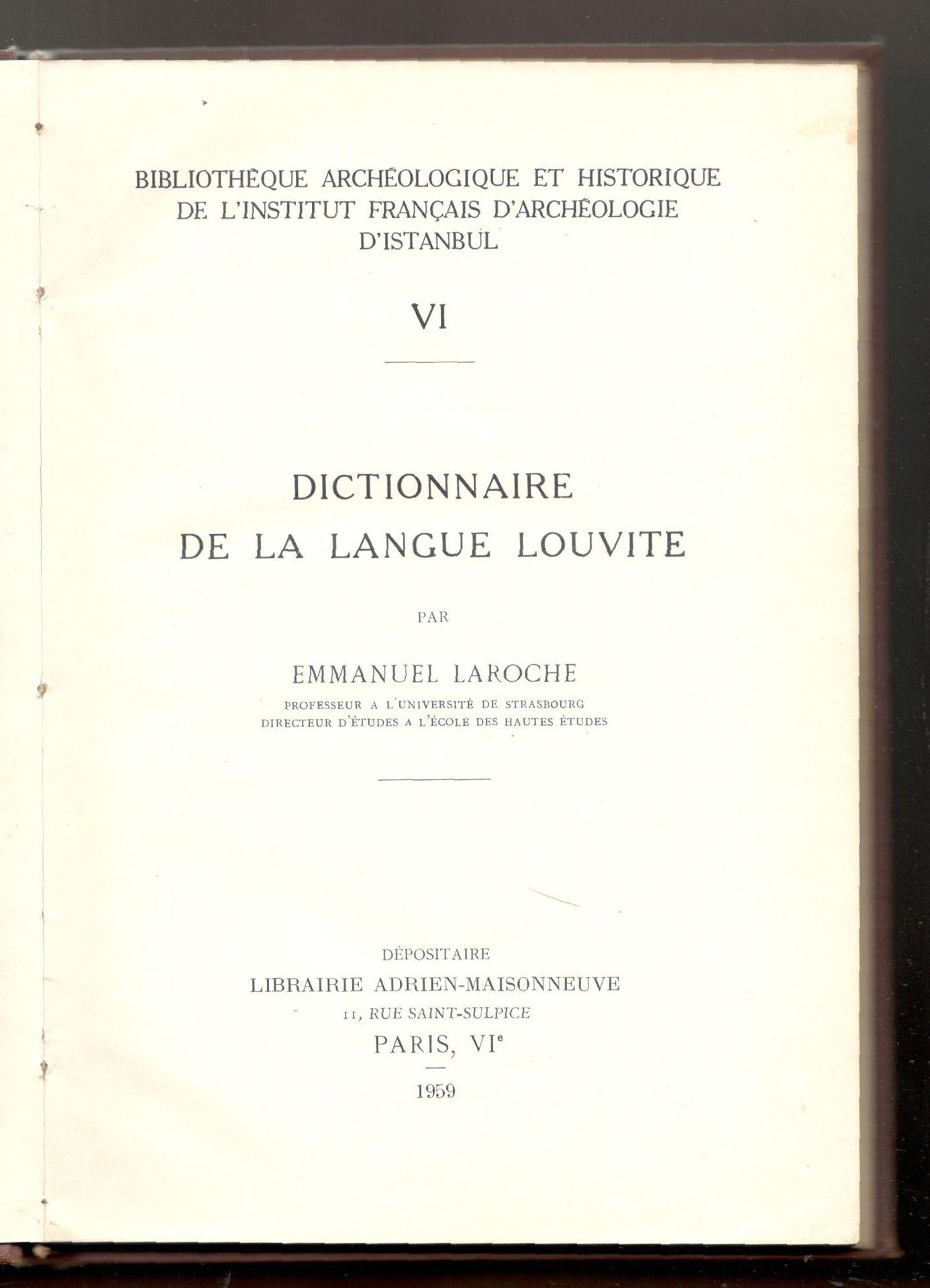 In 8°, pp. 179, (1). Tela bruna dell'epoca. Copia con note marginali e qualche sottolineatura a penna a una decina di pagine, altrimenti buono stato. Bibliothéque Archéologique et Historique de l'Institut Français d'Archéologie d'Istanbul, VI. l luvio è una lingua indoeuropea appartenente al sottogruppo luvio del ramo anatolico parlata a sud ovest della capitale dell'impero ittita, Hattuša, dal popolo dei Luvi.