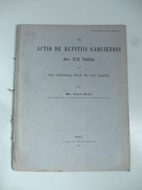 In 8 (cm 19 x 24), pp. 32. Brossura editoriale con dorso rifatto. Saggio in lingua tedesca sulla Lex Aquilia sul risarcimento del danno con particolare riferimento alla possibile interpretazione del vocabolo "rupitias" e dell'espressione "de rupitiis sarciendis".