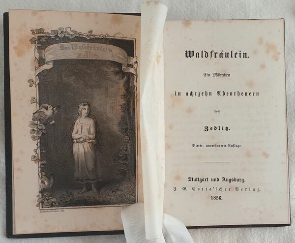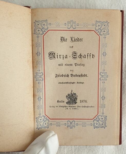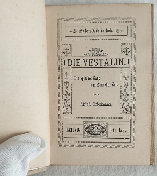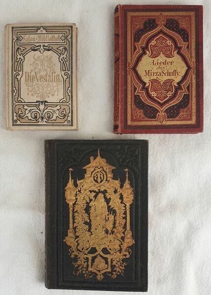 Lotto di tre volumi ottocenteschi di poesia in lingua tedesca. Il primo di Alfred Friedmann senza data ma di fine ottocento. Firma alla prima sguardia. Il secondo del 1856 di Bedlig. Incisione in antiporta coperta da velina. Firma alla prima carta bianca datata 1878. Il terzo del 1876 di Friedrich Bodenstebt. Testo entro cornice azzurra. In buone condizioni. Copertina in tela editoriale decorata in ottime condizioni generali con lievi usure ai margini e dorso. Legatura in buone condizioni ma rottura alla seconda opera. All'interno le pagine si presentano in ottime condizioni. In 24. Dim. 9,5x7, 13,5x9,5, 11,5x8 cm. Pp. 141+(2)+15+(1), XII+167+(5), XXIV+199+(1) Lot of three volumes of 19th century of poems in german language. the first one by Alfred Friedmann is no dated but of late 19th century. Signature in the first endpage. The second one of 1856 by Bedlig. Engraving in the frontspice covered by tissue paper. Signature in the first endpage dated 1878. The third one of 1876 by Friedrich Bodenstebt. Text in a light blue frame. In good conditions. Cloth editorial decorated cover in very good general conditions lightly worn in the extremities. Binding in good conditions but crack in the second work. Inside pages are in very good conditions. In 24. Dim. 9,5x7, 13,5x9,5, 11,5x8 cm. Pp. 141+(2)+15+(1), XII+167+(5), XXIV+199+(1)<BR><BR>