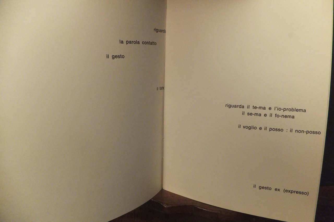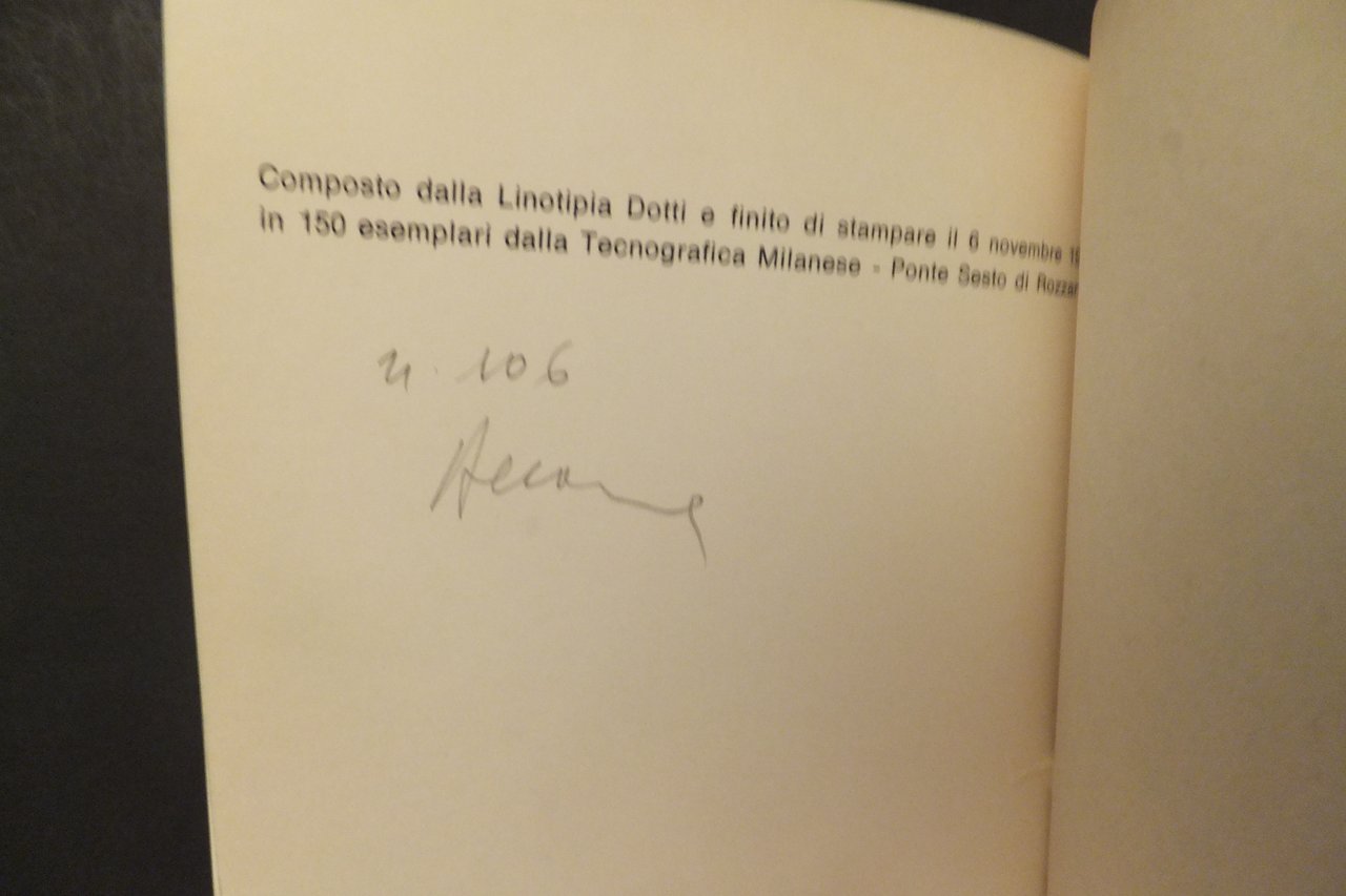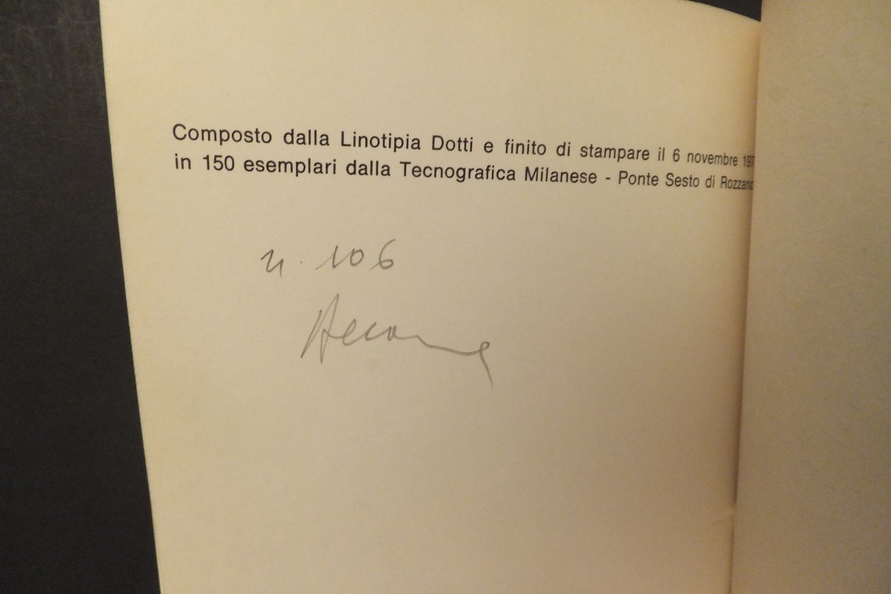 COMPOSTO DALLA LINOTIPIA DOTTI E FINITO DI STAMPARE IL 6 NOVEMBRE 1972 IN 150 ESEMPLARI DALLA TECNOGRAFICA MILANESE - PONTE SESTO DI ROZZANO- NOSTRA COPIA N. 106 CON FIRMA AUTORE - BROSSURA 17 X 10,5 PP. NON NUMERATE - BUONE CONDIZIONI, DORSO E PIATTI LEGGERMENTE BRUNITI.