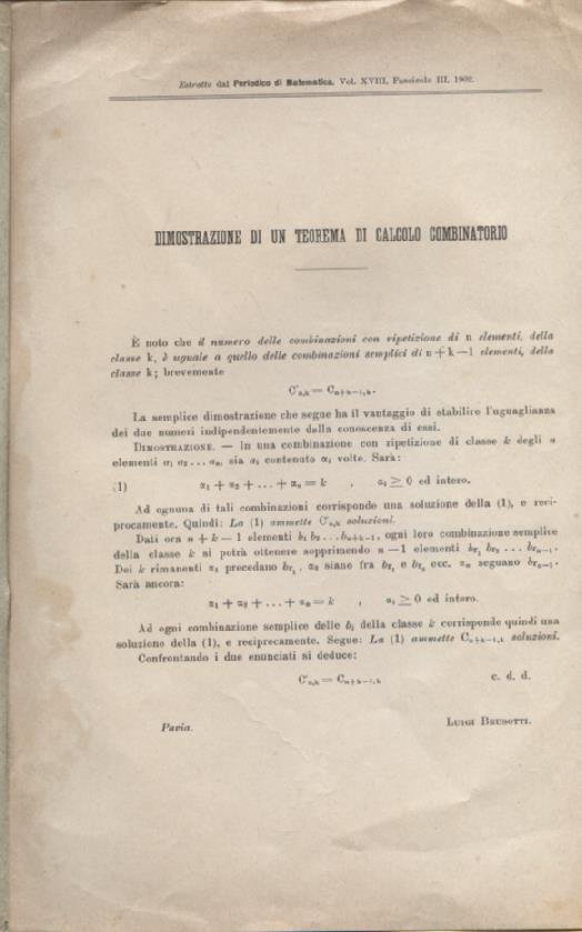 Dimostrazione di un teorema di calcolo combinatorio. Estratto dal Perodico di Matematica, vol. XVIII, fascicolo III, 1902
