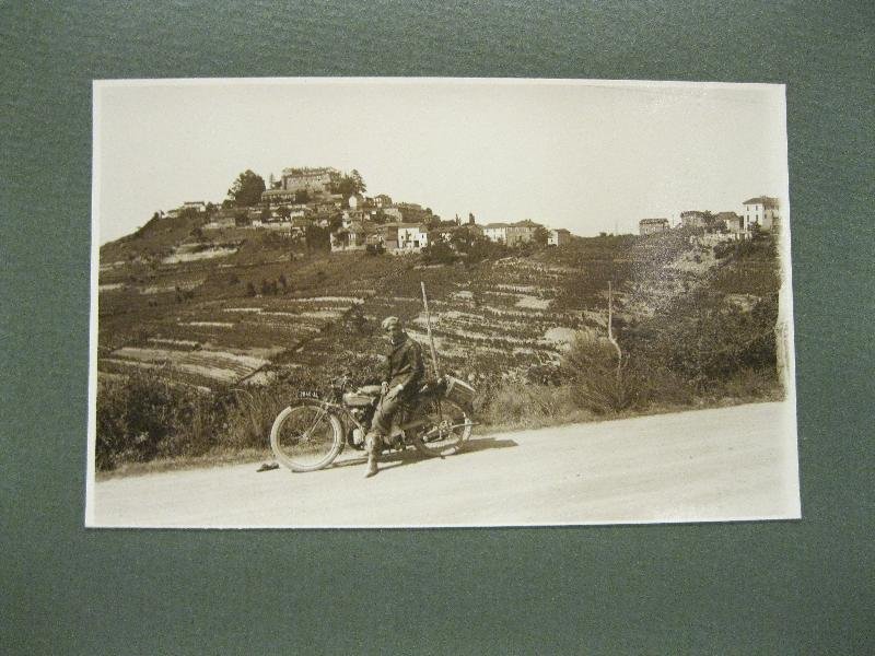 Fotografia originale vintage in b/n, stampa alla gelatina ai sali d'argento, didascalia manoscritta al verso, misura cm 13,7 x 8,5 montata su cartoncino bordato cm 23 x 17, ritrae un uomo fermi in sella alla sua motocicletta, sullo sfondo veduta del paese di Cremolino, in lontananza sul pendio il castello.