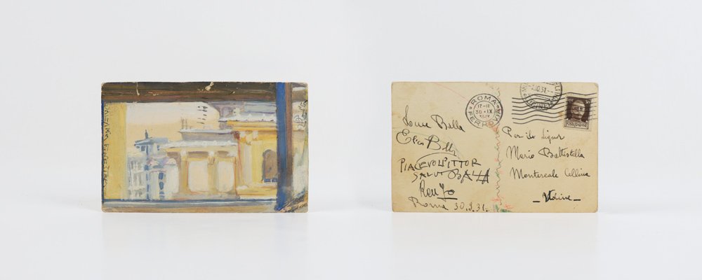 AUTOGRAFODipinto a tempera su cartolina.Ottime condizioni di conservazione, viaggiata (minime abrasioni al disegno, con due fori di puntina appena percettibili alrecto; francobollo conservato).Bello scorcio di Roma vista nella cornice della finestra. Firmato e titolato ai bordi della composizione, in inchiostro blu: «BallElica». La cartolina è inviata al «Signor Mario Battistella» e reca al verso le firme autografe di Luce, Elica, e del padre Giacomo Balla, che scrive: «PIACEVOLPITTOR | SALUTBALLA».