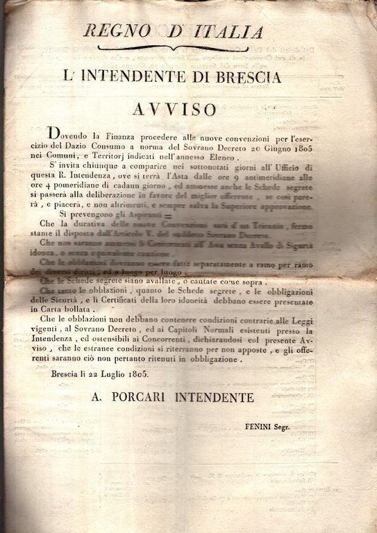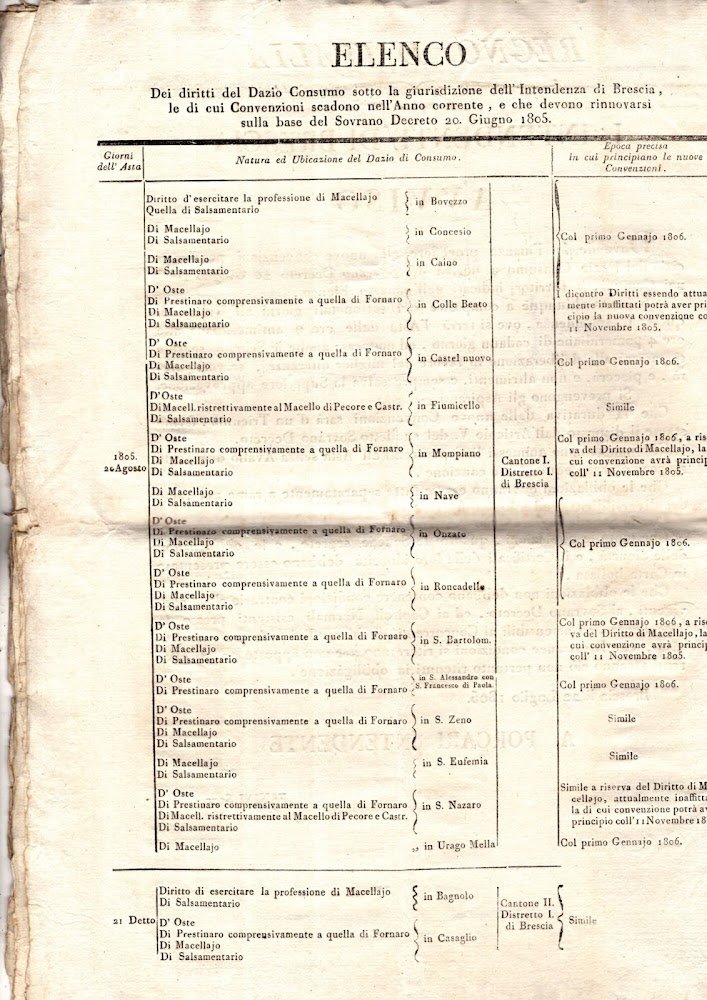 Diritti del Dazio Consumo sotto la giurisdizione dell'Intendenza di Brescia 1805