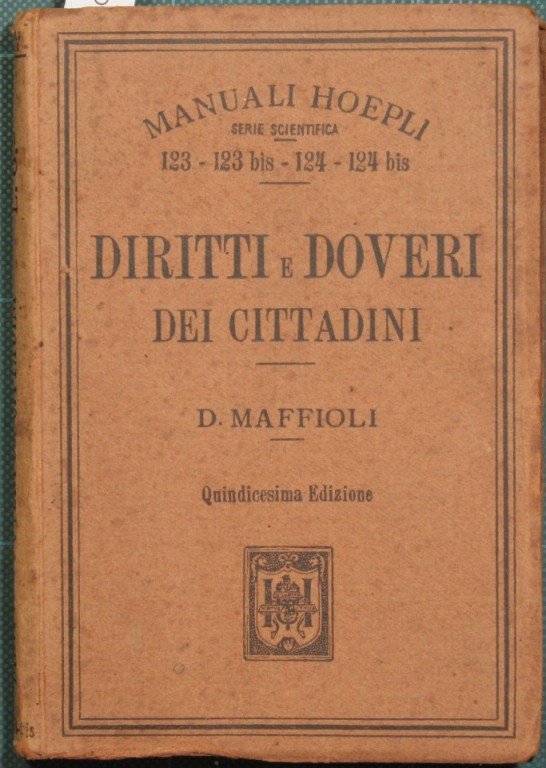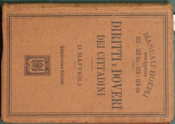 Secondo le istituzioni dello Stato - Per uso delle pubbliche scuole. Quindicesima edizione con appendice sul Codice Penale - Collana Manuali Hoepli - Serie scientifica. Nn. 123-124 - in 16° - pp.XII + 233 - Brossura editoriale