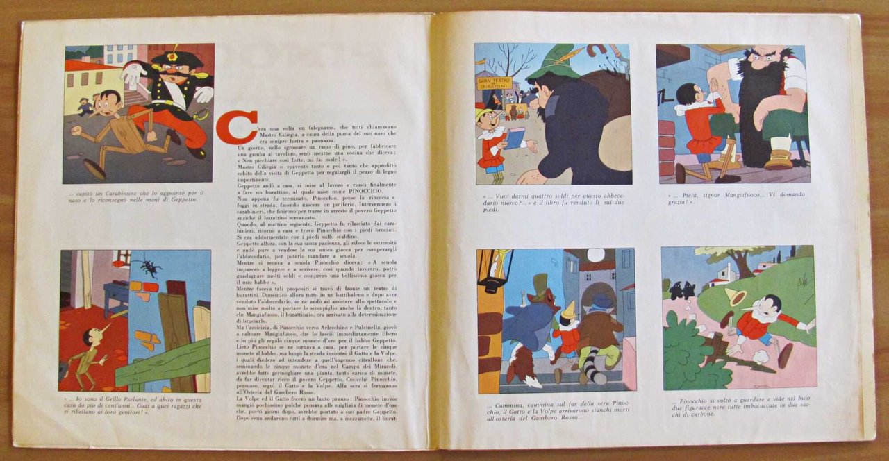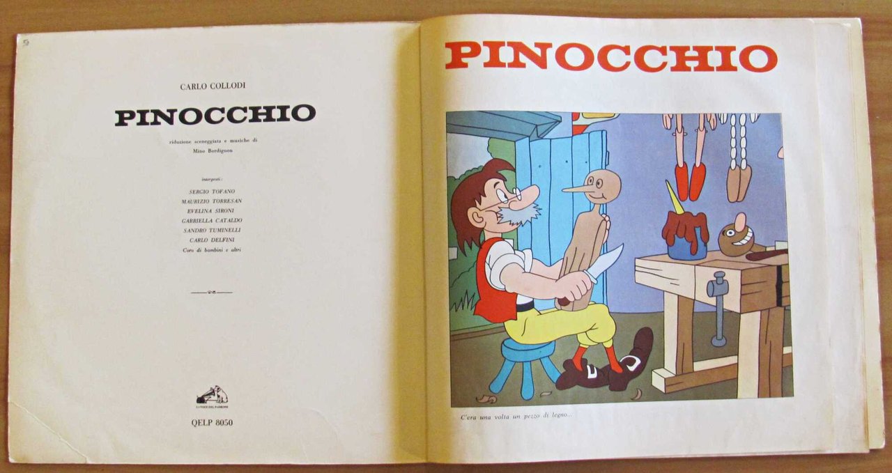 Carlo Collodi - Interpreti: Sergio Tofano, Maurizio Torresan, Evelina Sironi, Gabriella Cataldo, Sandro Tuminelli, Carlo Delfini più Coro dei bambini ed altri. Pinocchio con riduzione sceneggiata e musiche di Mino Bordignon. Illustrazioni a colori n.t. con Disco 33". La Voce del Padrone - Milano, s.d. anni '60. Brossura editoriale protetta da velina originale con tasca in fine contenente il Disco. Piccolissima imperfezione al margine basso del dorso. 31x31; pp.6 non numerate. Raro e in Ottimo stato. , Ottimo (Fine)