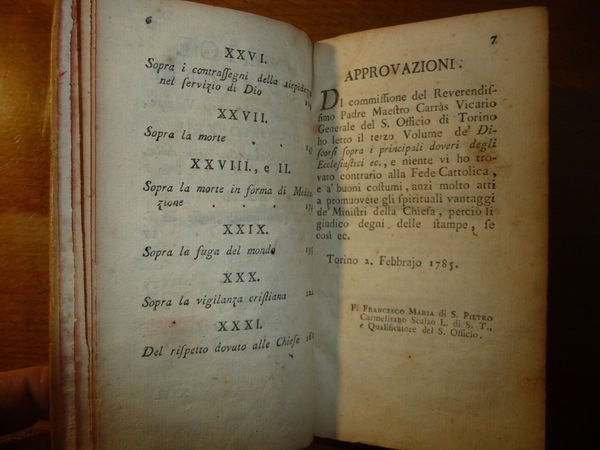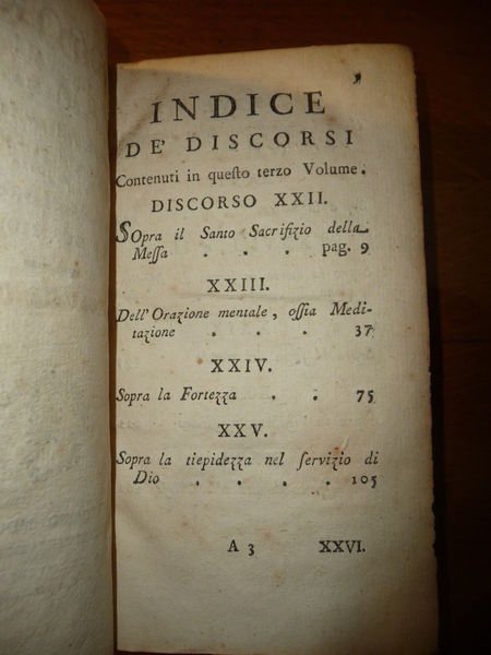 TITOLO: DISCORSI SOPRA I PRINCIPALI DOVERI DEGLI ECCLESIASTICI che possono altresi per la maggior parte esser utili ad ogni sorte di persone Vol. III DESCRIZIONE: Stamperia Mairesse Torino 1785 rilegatura d'epoca in pelle, pp. 320 in 16°. CONDIZIONI: Ottime, solida legatura, titolo al tassello con 5 nervature, tagli in rosso. PESO / WEIGHT: 219 gr. without package