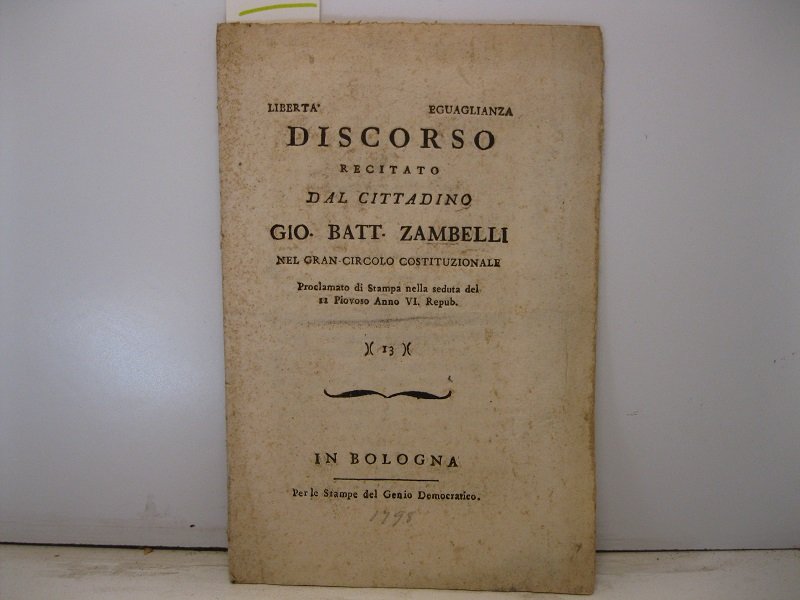 In 8, pp. 7 + (1b). Br. ed. Ed. orig. di questo discorso tenuto nel circolo del 'Genio Democratico' negli anni del governo giacobino a Bologna, sotto la Repubblica Cisalpina. I frequentatori potevano esprimere idee e punti di vista negli incontri domenicali presso la Sala della Scuola delle Arti nel Palazzo dell'Archiginnasio. In questo discorso, venato da un forte spirito anticlericale, l'autore si scaglia contro la religione equiparata alla superstizione ed esalta il solo valore della ragione.