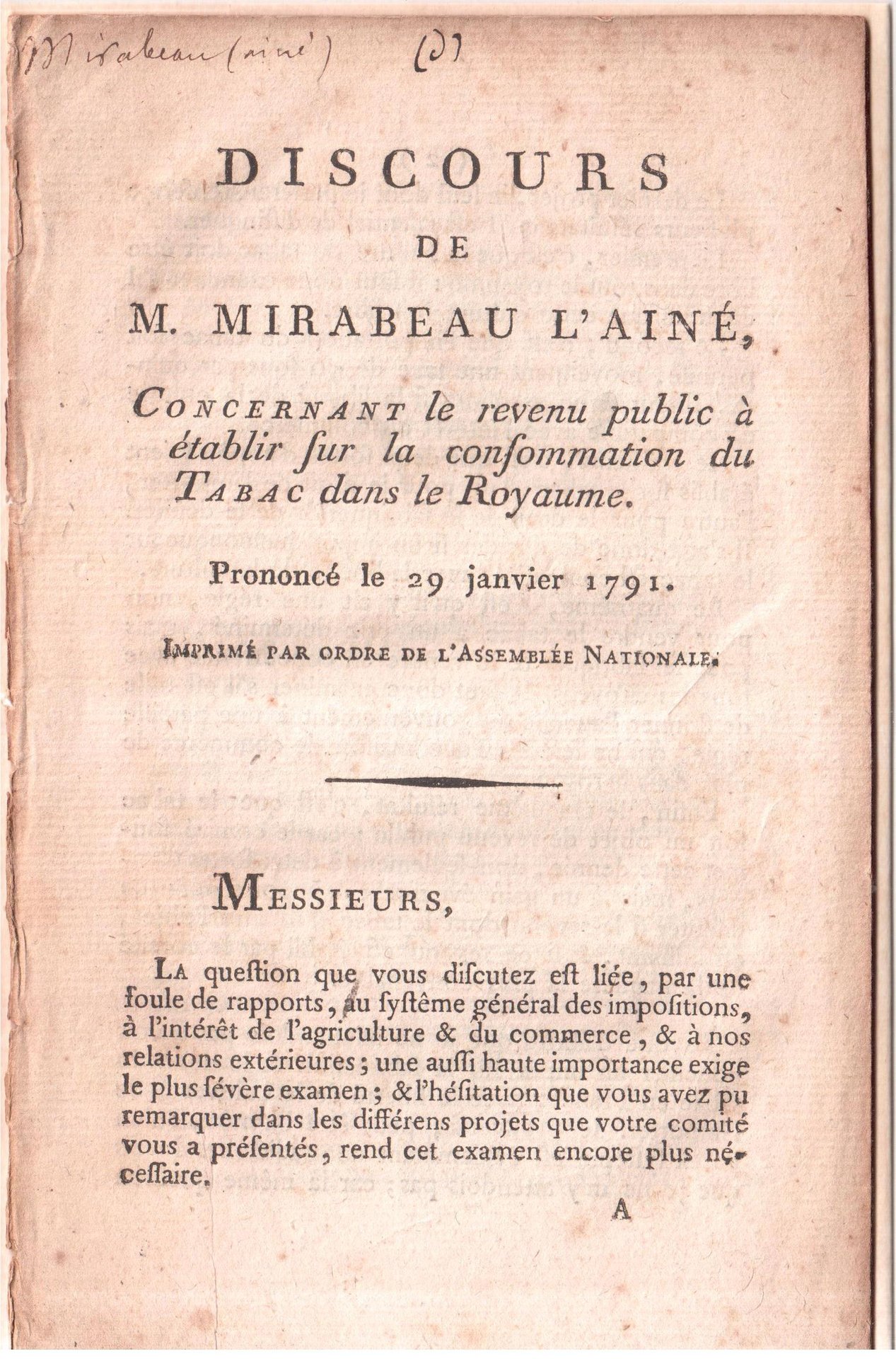 Discours de M. Mirabeau l'Ainé, concernant le revenu public à établir sur la consommation du tabac dans le Royaume Prononcé le 29 janvier 1791