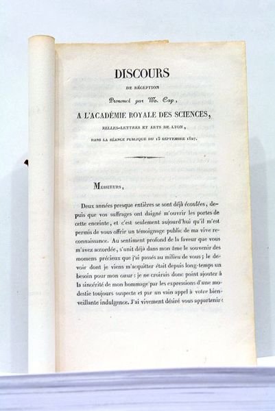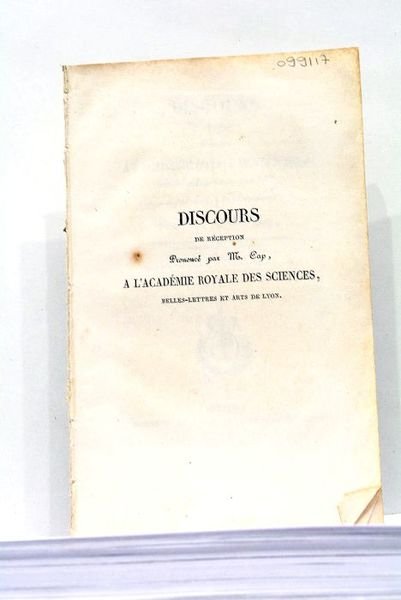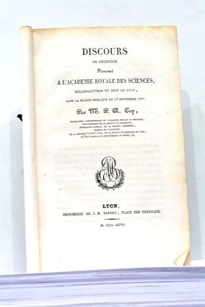 21 pages (20,5x12,5cm). Broché. Rares et petites rousseurs. Académie Royale des Sciences de Lyon. Pharmacie. Science (Newton, Lavoisier, Humboldt, Cuvier, Boyle, Descartes, etc).