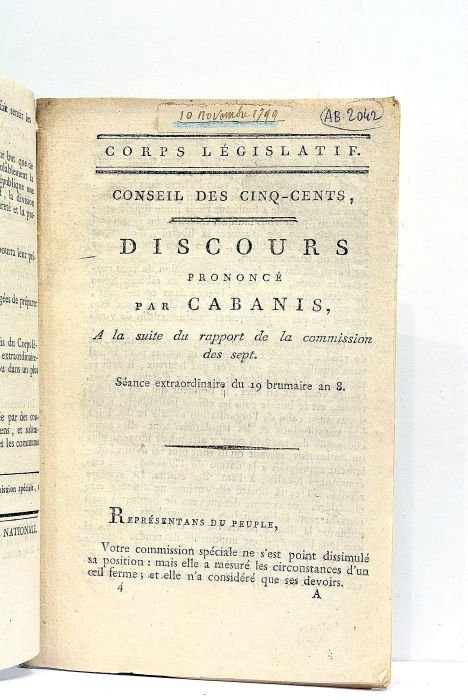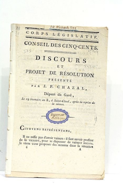 in-8. 10pp. Broché. Dos renforcé. Cachet. Marges irrégulieres. Rare impression de Saint-Cloud. Projet prévoyant la fin du Directoire et la mise en place d'une "commission consulaire exécutive" composée de Sieyes, Roger-Ducos et Bonaparte. Gard. Consulat. Bonapartisme.