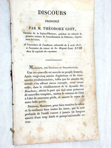 Discours prononcé à l'ouverture de l'audience solennelle du 4 août 1815, à l'occasion du retour de Sa majesté Louis XVIII dans la capitale du royaume.