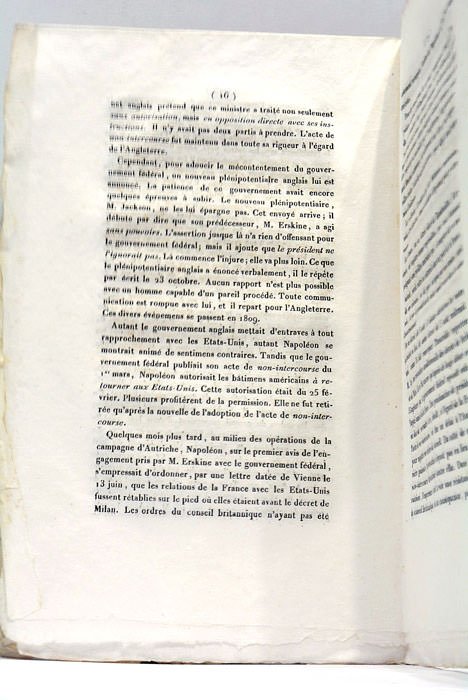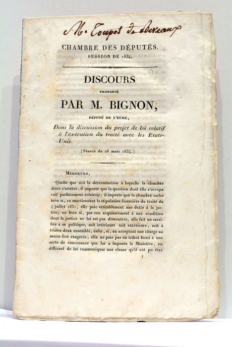 32 pages. (22x14 Cm). Dérelié. Texte de l'historien et homme d'Etat, Louis Pierre Edouard Bignon. Il traite des problèmes soulevés par le Traité de 1831 entre la France et les Etats-Unis, avec des références à la cession de la Louisiane en 1803. Tiré à part du "Moniteur". Document non-coupé. Rares rousseurs.