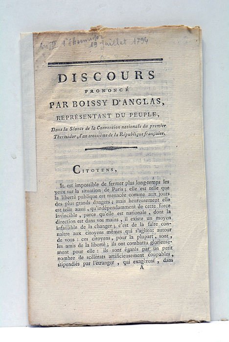 in-8. 15pp. Non reliés. Dos renforcé. Non rogné. Petites salissures. Déchirure sur la 1ére page. Défense de la Convention nationale. Révolution française.