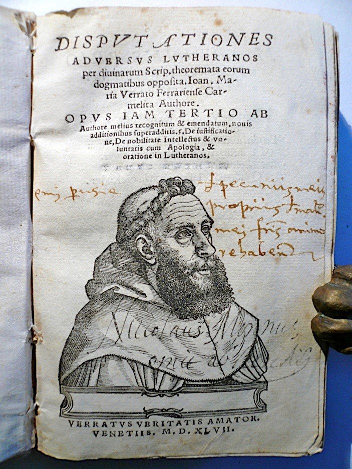 In-8° (15,1x9,9 cm). (8), 271, (1) carta. Bel ritratto dell'autore inciso al frontespizio. Epistola dedicatoria a papa Paolo III. Legatura coeva in piena pergamena con titolo calligrafato su tassello al dorso. Nota manoscritta sul forntespizio. Lopera è costituita da un solo volume, anche se al frontespizio compare la scritta TOMUS PRIMUS. Terza edizione. La prima 1538, la seconda 1544, usci una 4° nel 1554. Opera in latino del Verrati contro le idee luterane. Si articola in 18 capitoli, affrontando i classici temi della controversia tra cattolici e luterani. Verrati, teologo carmelitano, filosofo e oratore (ca. 1490-1563). Insegnò Sacra Scrittura e Teologia a Bologna e a Ferrara, dove fu anche priore. Combatté il luteranesimo. EDIT 16/ICCU/CNCE/23190.