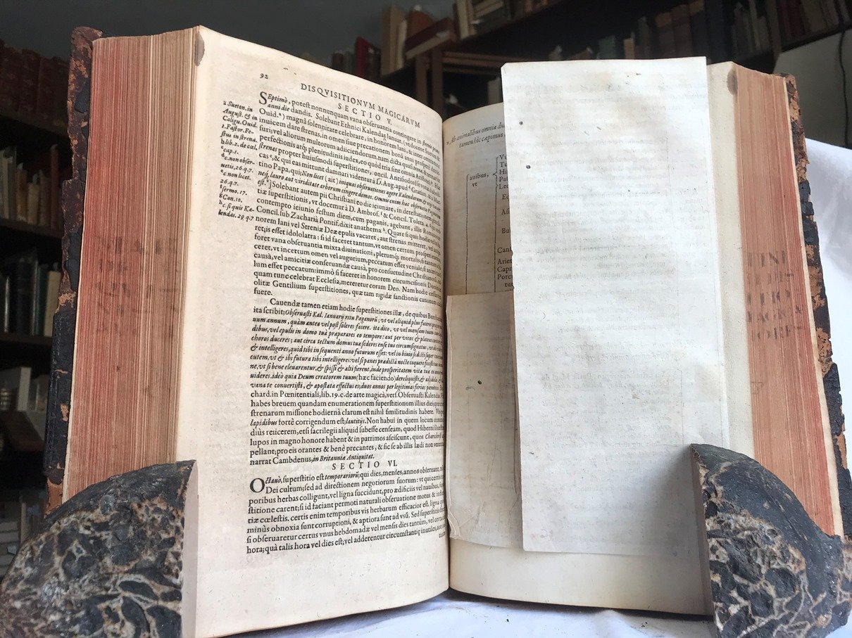 Volume in folio legato in pelle di porco impressa a secco su assi di legno ('alla cappuccina'), dorso rinforzato in pelle ab antiquo (mende e piccole mancanze ai piatti, segni di tarli), sguardie (motto a pennino 'Assai ben balla a chi la Fortuna suona' e timbro d'estinta biblioteca straniera, presente anche sul frontespizio), frontespizio inciso in rame con cartiglio centrale ed 11 vignette che lo contornano tutte riferite all'Esodo, 10 carte, bianca, 276 pp., 8 carte d'indici, occhiello, 268 pp., 9 carte d'indici, bianca, occhiello, due carte, 250 pp., 6 carte d'indici. Che dire: forse l'opera pi vasta, esauriente ed esaustiva sulle arti magiche ed esoteriche scritta da Del Rio e che ebbe subito un'eccezionale accoglienza. E quella presentata forse l'edizione pi bella e ricercata, preziosa e rara. La copia in catalogo ha i piccoli difetti citati alla legatura (peraltro accettabile, anzi) e presenta tracce puntiformi di tarlo (e questo dovuto principalmente alla presenza delle tavolette di legno della legatura) che non causano mai fastidio alla lettura e passano quasi del tutto inosservate. Qualche raro quaderno brunito d'un tenue tabacco. Lo studioso della materia esoterica quanto il curioso ed il ricercatore troveranno nell'opera eccezionale interesse. In bello stato, raro esemplare
