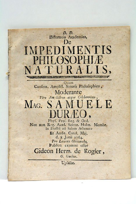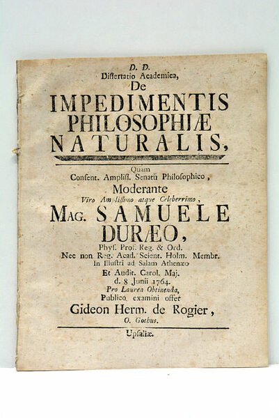 Dissertatio Academica De Impedimentis Philosophiae Naturalis, Quam Consent. Amplist. Senatu Philosophico, Moderante Viro Amplissimo atque Celeberrimo, Mag. Samuele Duraeo.