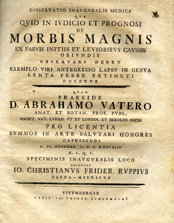 In-8°, pp. XXIV, brossura antica in marmorizzatura policroma. Testatine, finalini e capilettera ornati in xilografia. Bruniture dovute al tipo di carta. Dissertazione di diagnostica e sintomatologia medica letta a Wittemberg il 6 novembre 1744 al cospetto di Abraham Vater, professore di anatomia e botanica. Svariati cenni sono riservati alle emorroidi.