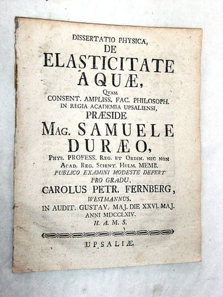 in-4. 10pp. Broché. Papier un peu affaibli. Légères traces de plis. Assez bon exemplaire. Curieuse thèse imprimée à Uppsala et réalisée sous la tutelle de Duraeus sur l'élasticité de l'eau. Elle contient des descriptions d'expériences de physique.