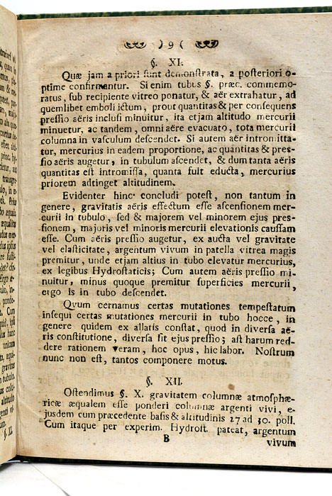 1 feuillet. 18 pages. (18x14 Cm). Cartonnage moderne. Dos lisse doré. Edition imprimée à Uppsala en Suède de cet intéressant mémoire réunissant plusieurs expériences sur la pression de l'air, avec références à Newton, Otto de Guericke, Torricelli, etc. Petite planche avec deux figures gravées insérée entre les pages 16 et 17. Papier un peu bruni. Exemplaire très bien conservé.