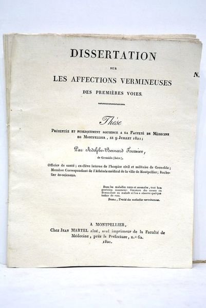 Dissertation sur les affections vermineuses des premières voies. Thèse présentée et publiquement soutenue pa la Faculté de Médecine de Montpellier, le 9 juillet 1821.