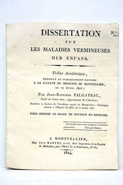 Dissertation sur les maladies vermineuses des enfants. Tribut académique présenté et publiquement soutenu à la Faculté de médecine de Montpellier, le 12 avril 1824.