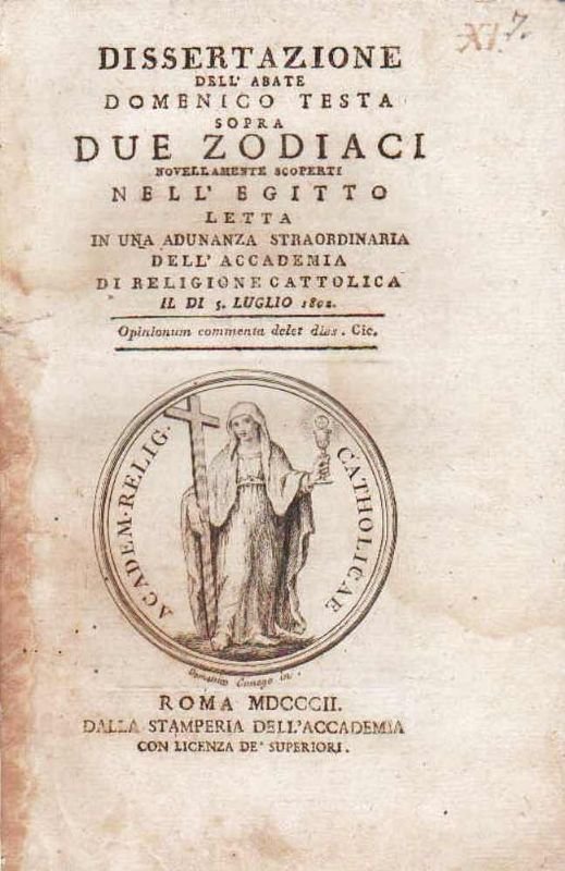 Dissertazione dell'Abate D. T. sopra Due Zodiaci novellamente scoperti nell'Egitto. Letta in una adunanza straordinaria dell'Accademia di Religione Cattolica il di 5. Luglio 1802.