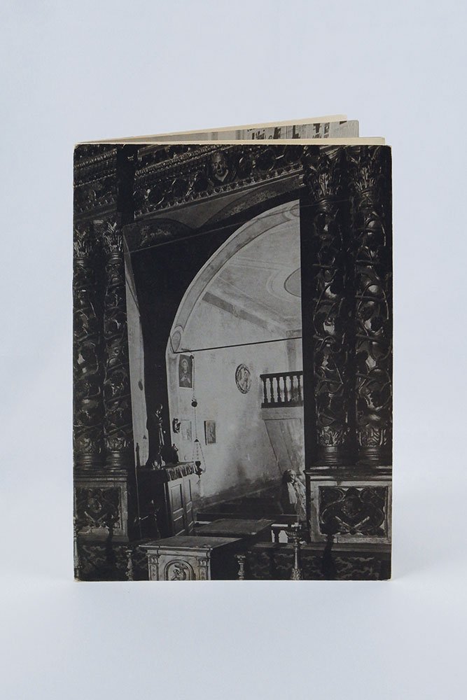 - brossura editoriale legata a doppio punto metallico, al piatto superiore riproduzione b/n a piena pagina di una fotografia di un’opera dell’artista,