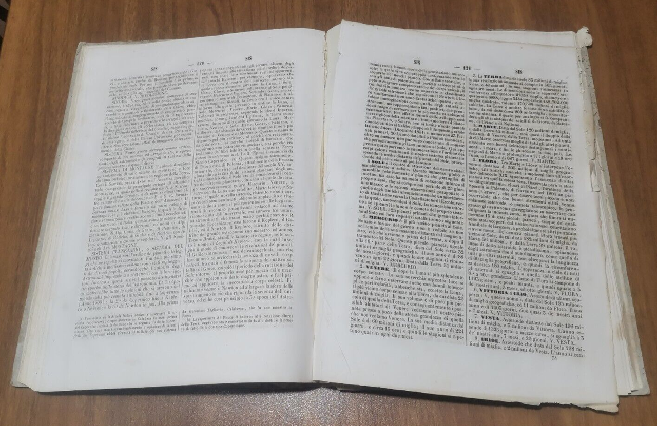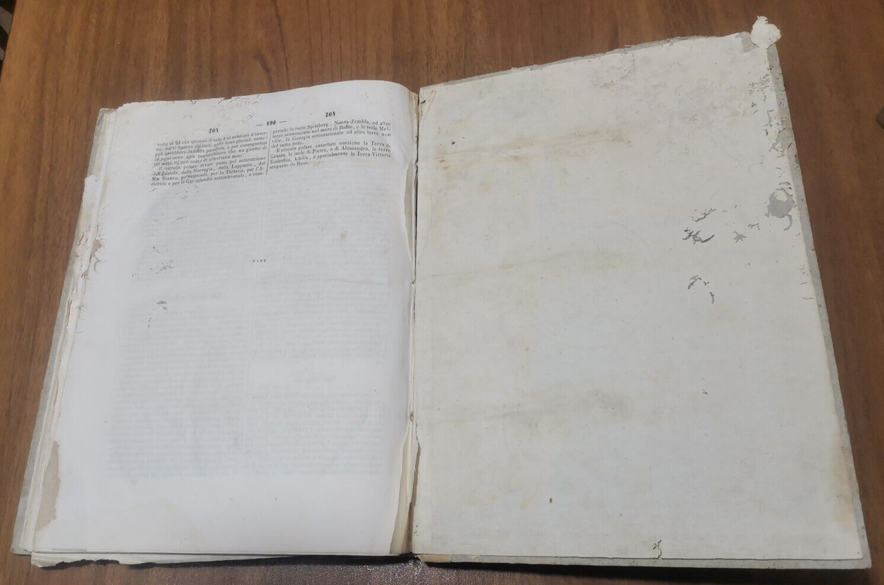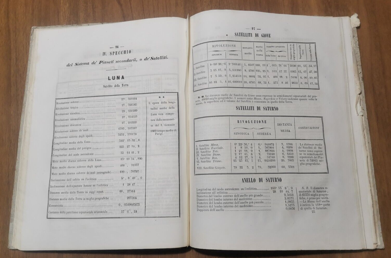 Napoli, Gaetano Nobile, 1852. (IV), 190 pagine, 3 tavole fuori testo di cui una ripiegata. Copertina in mezza pergamena. Dimensioni: 21,5 x 29 cm. Stato di conservazione: discreto buono (mancano 9 delle 12 tavole originarie, fioriture, numerose gallerie di tarlo estinto alle ultime pagine con insignificante perdita di testo, manca la copertura ai piatti) Libro antico astronomia