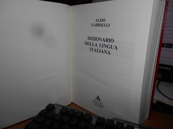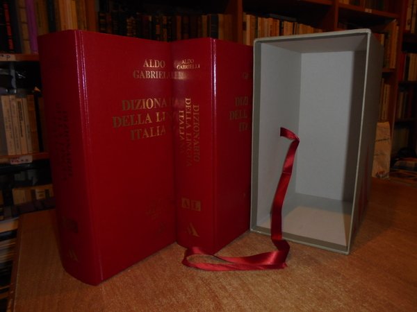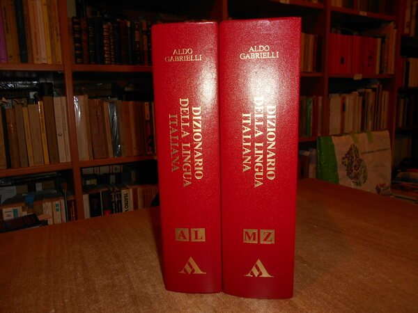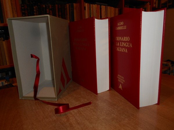 ALDO GABRIELLI. Milano, Arnoldo Mondadori, 1994. Dizionario della lingua italiana. 2 volumi in-8° grande, similpelle rossa con titoli in oro sui piani e ai dorsi, segnalibri in cotone rosso. AL. xxvii, (1181*) pp.; MZ. viii, da pag. 1167 a pag. 2558, (1) pp. Come nuovo con astuccio in cartone edit. rigido. Uff. A - II - 5