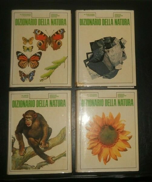 AA.VV., DIZIONARIO DELLA NATURA - 4 volumi - Mondadori - copertina rigida con sovracopertina e custodia in cartone, formato cm. 20 x 26 - custodia in buonissime condizioni con normali segni tempo/usura, sovracopertine in ottimo stato con la sola del vol. 4 con scotch su parte inferiore, visibile in foto, tutte le pagine in ottimo stato a parte una decina del vol. 4 che sono lievemente stropicciate e una con piccola riparazione con scotch