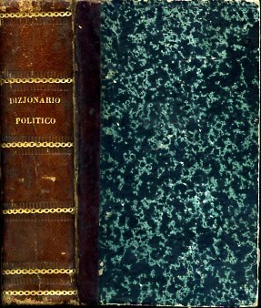 In-16°, pp. (8), 772, legatura coeva m. pelle marrone con titolo e ornamenti in oro e a secco al dorso. Piatti marmorizzati, tagli azzurri a spruzzo. Fioriture normali. Ottimo stato. Prima e unica edizione, di questo anonimo dizionario risorgimentale (l'autore non è mai stato identificato) di economia politica, di pensiero politico e di geopolitica. Le numerosissime voci, raggruppate alfabeticamente, discorrono dei diversi orientamenti politici (incluso il socialismo e le tendenze socialisteggianti), delle forme di governo, delle diverse nazioni del mondo secondo il prospetto della geopolitica, delle materie militari, ecc. Alle pp. 762 e sgg., 'Quadro de' principali potentati' con tabelle relative alle varie nazioni europee ed extraeuropee, con dati sulle loro superfici territoriali, la popolazione, le entrate e il debito nazionale, la consistenza delle forze armate, ecc. Manca ed Einaudi.