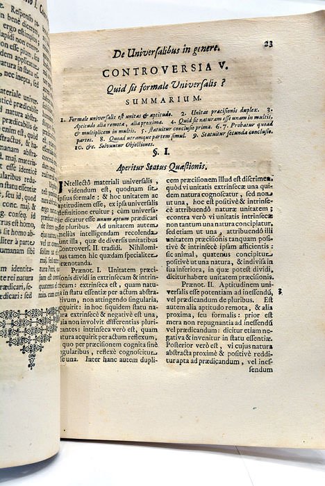 6 feuillets. 253 pages. 1 feuillet. (23x18 Cm). Broché. Couverture de l'époque en papier décoré. Plat inférieur manquant. Tranches dorées. Manques de papier au dos. Edition très rare de cette volumineuse dissertation philosophique imprimée à Salzburg, dans laquelle étaient notamment abordées de nombreuses questions scientifiques: "De Universalibus in genere", "De Scientia in genere", "De Principiis Corporis Naturalis", "De Continuo", "De Infinito", "De Loco et Vacuo", "De Mundo", "De Primo Motore", etc. Bon exemplaire à part quelques taches, rousseurs et de certaines pages un peu brunies.