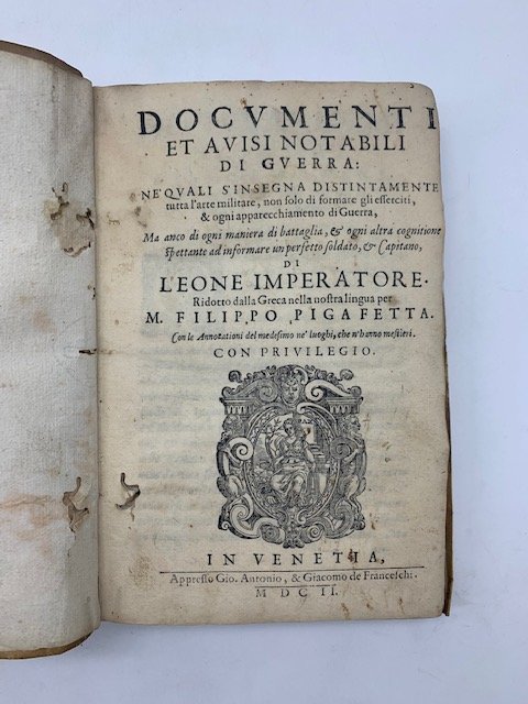 In 8 (cm 13,5 x 21), pp. (40) + 344 (ma 346 perche' sono ripetute le pp. 319-320). Frontespizio rifilato. Galleria di tarlo al margine interno delle prime 24 pagine incluso il frontespizio, poi forellino di tarlo fino a pagina 168. Legatura coeva in piena pergamena. Trattato di arte militare ascritto all'imperatore Leone VI (866-911). La traduzione dal greco in italiano e' di Filippo Pigafetta (1533-1604), architetto militare vicentino (la prima edizione del volgarizzamento e' del 1586 con differente titolo "Trattato brieve dello schierare in ordinanza gli eserciti"). D'Ayala, p. 36.