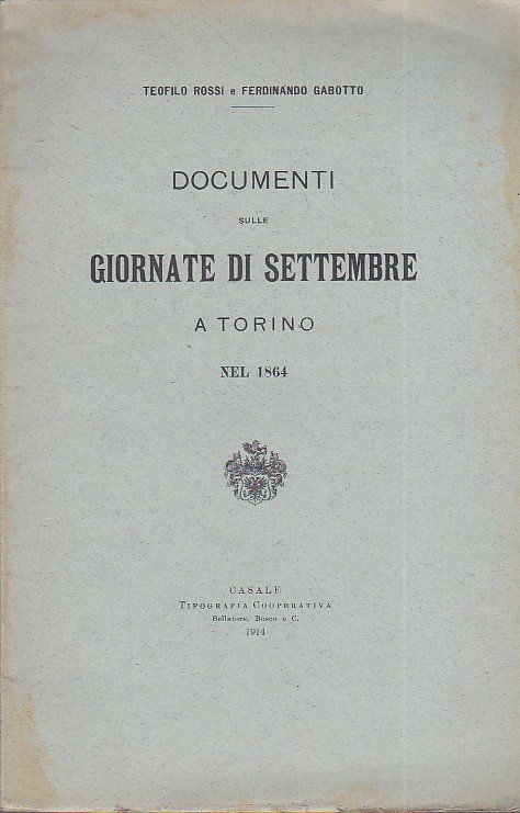 In-8°, pp. 34, brossura editoriale. Invio autografo di Teofilo Rossi alla copertina. Estratto dal 'Bollettino storico-bibliografico subalpino', supplemento Risorgimento, n. IV.